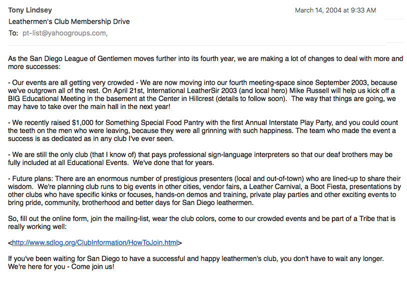 I spent the following year fruitfully.  I created even more initiatives, including what became a hugely successful Gay Leathermen's Dance Party called Rampart.  I had created a gay leathermen's resources site called the PT-Website (Papa Tony Website).  I created a gay leathermen's group called the San Diego League of Gentlemen, based upon LA's Avatar group.