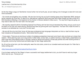 The email invited interested parties to come to an event that very night, where they would discuss ways to keep me from participating in the Mr. San Diego Leather 2000 contest.  This event was being hosted by four of the contest's judges, at one of our long-ago leather bars. My buddy Mark went, and berated everybody else.  They had accepted my money and my entry-form.  Legally, they were honor-bound to let me run for the title.