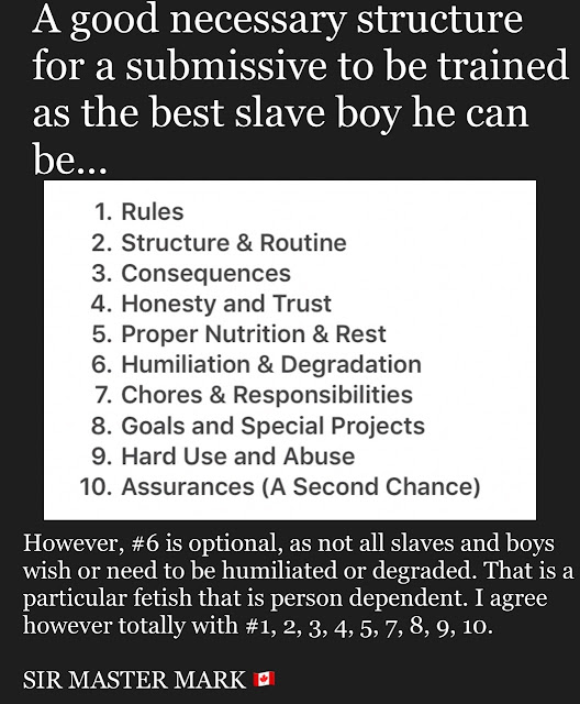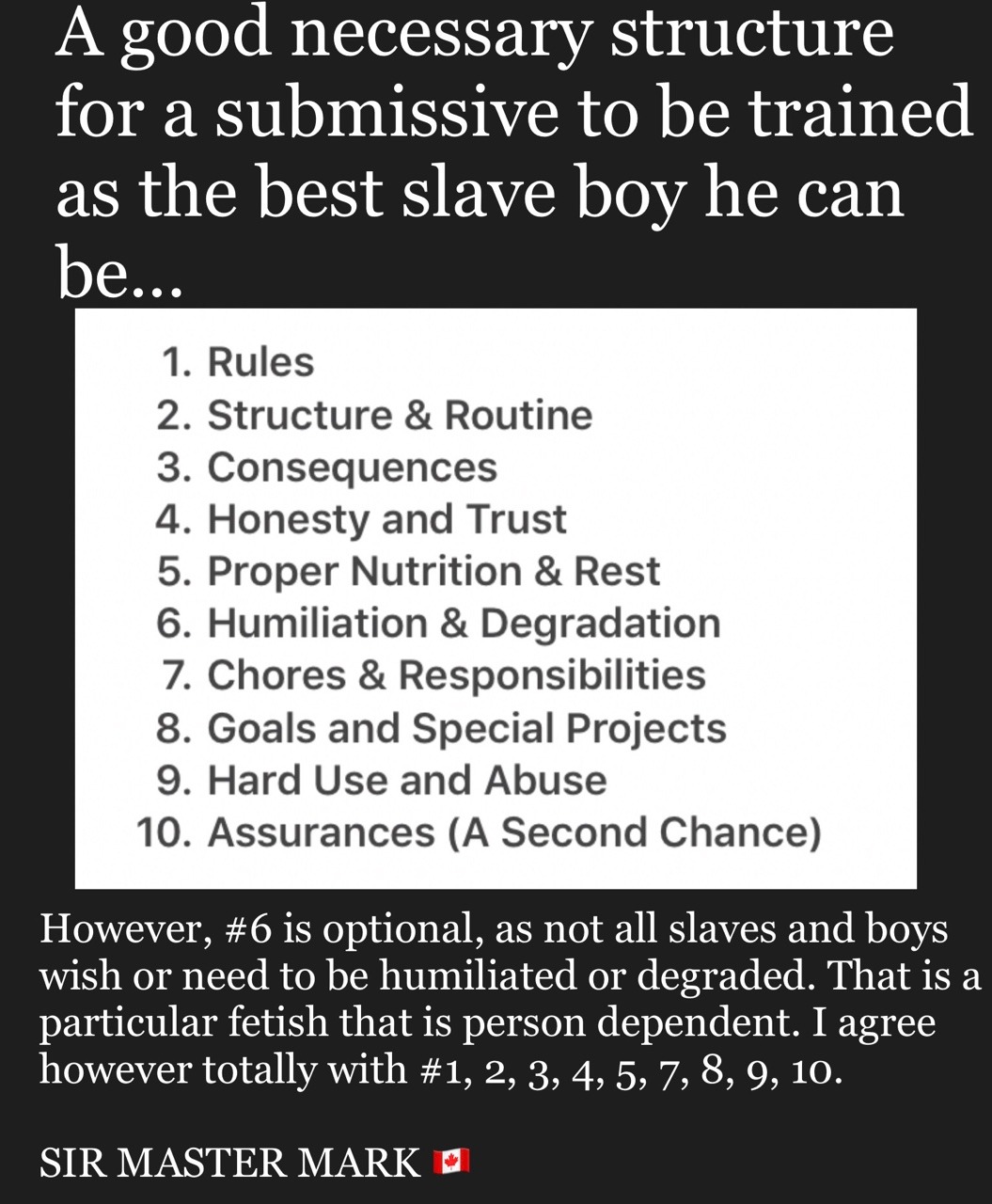 As for 6, I would reword it as “Humility.” There is no degradation in being humble and accepting a subordinate role in a relationship. Techniques that encourage that are fine provided they also build self-esteem around the sub’s role.