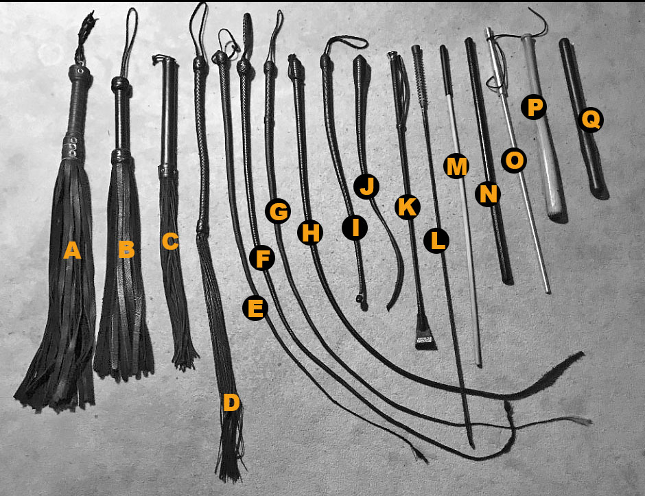 J. Short Whip: it’s a rubber one with a leather tail. Also, very effective and Master uses it to give me bastinado too.