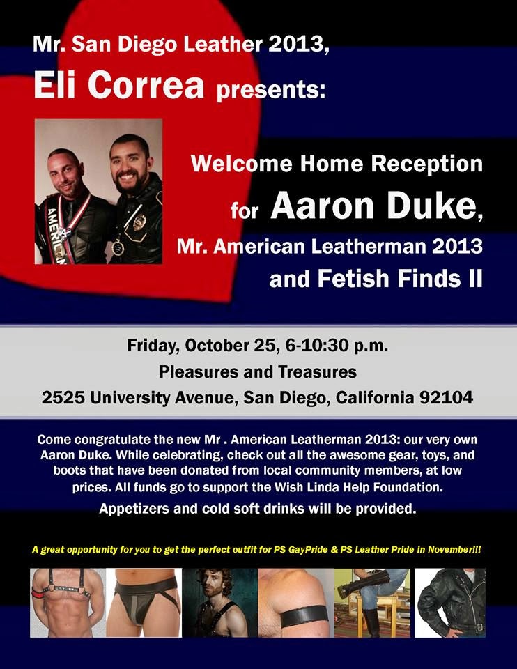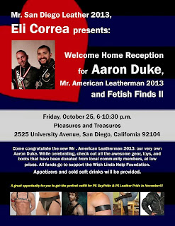 Friday, Oct. 25, 6:30-10PM: Welcome Home our American Leatherman 2013: Aaron Duke, and Fetish Finds Social, hosted by San Diego Fetish Brotherhood.